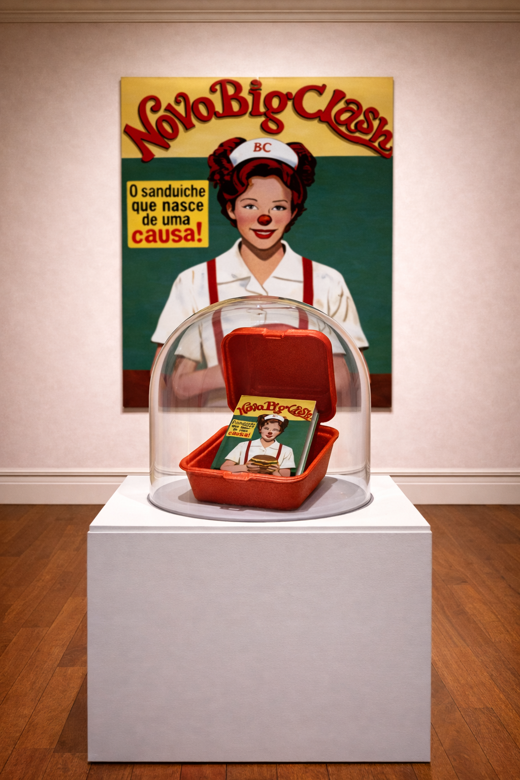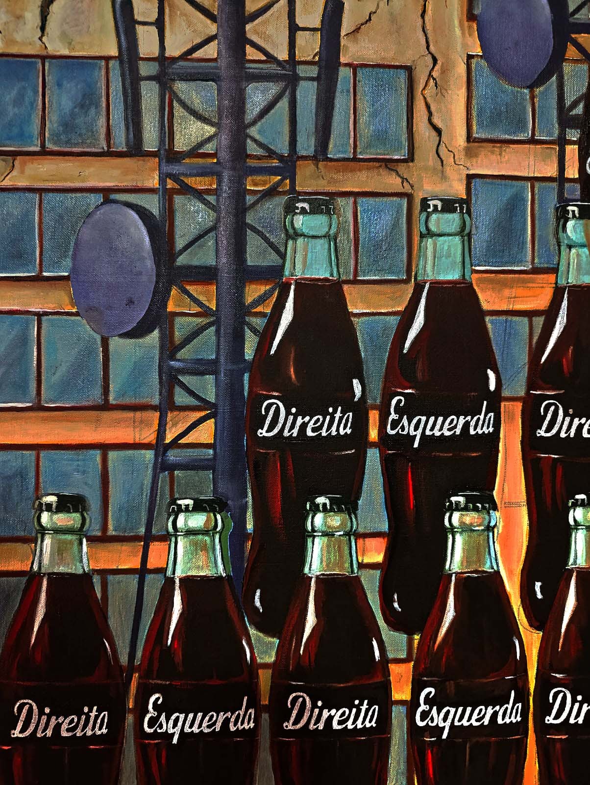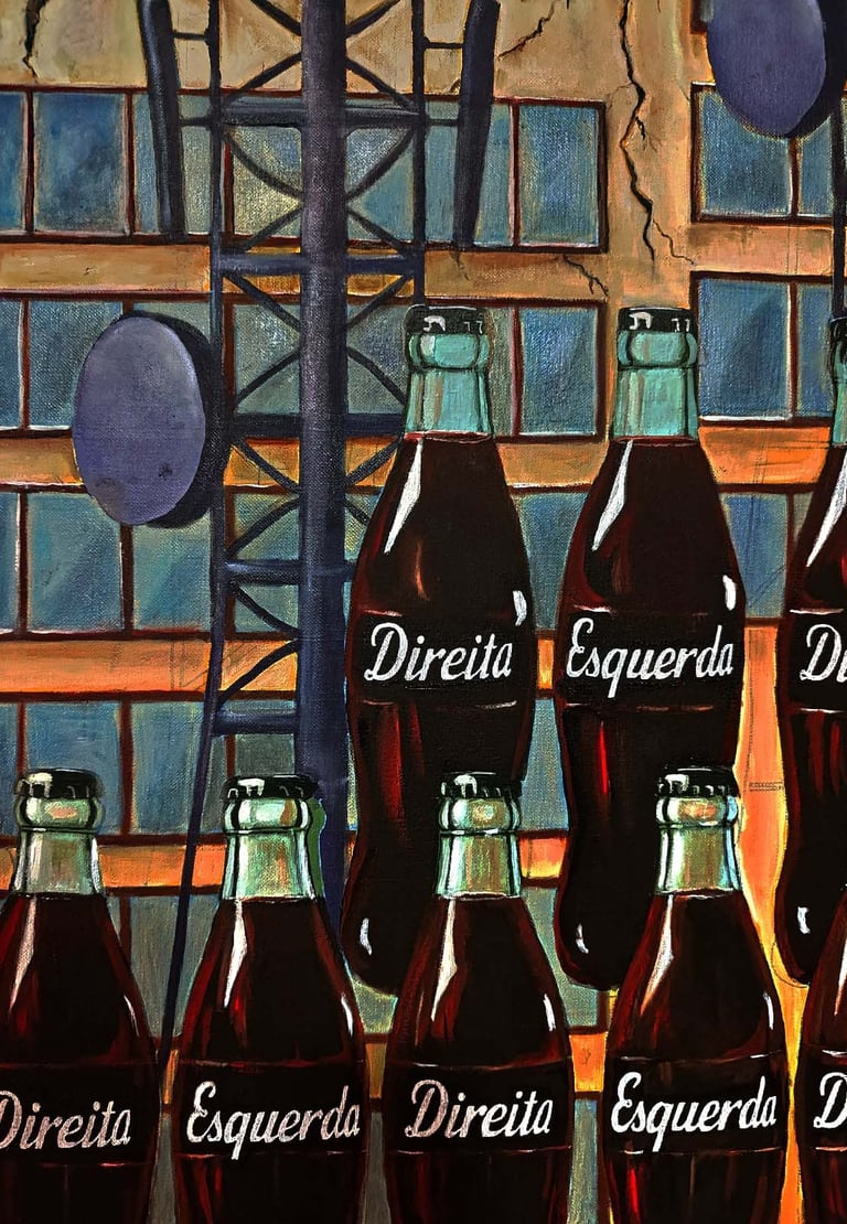 Em Coca-colonização, o alinhamento das garrafas produz um campo visual rigoroso, quase hipnótico. O olhar é convocado a percorrer fileiras que, à primeira vista, oferecem uma escolha binária. A inscrição de palavras que remetem a posições de debate sugere um jogo conhecido, mas o ritmo dos elementos revela outro enigma: nada ali parece sujeito ao dissenso propriamente dito, tudo está preparado para adesão imediata.