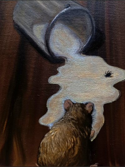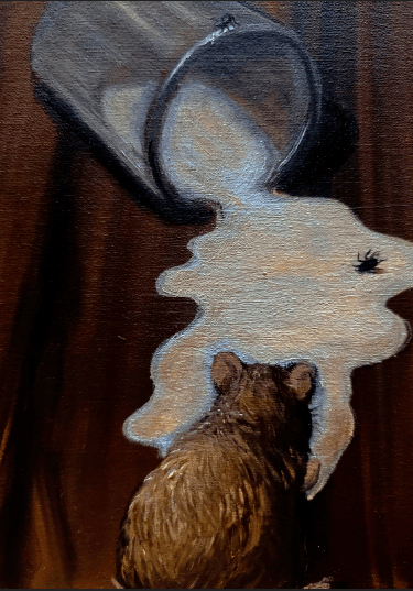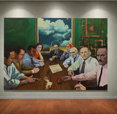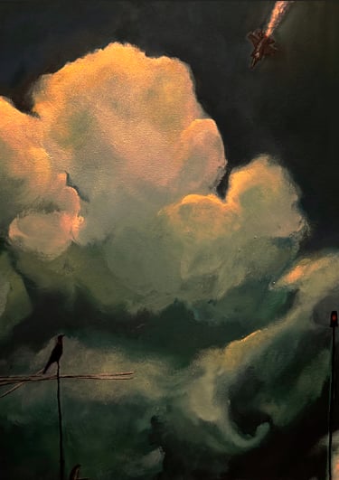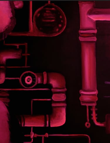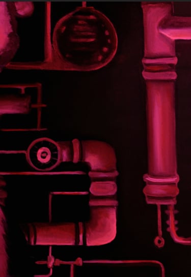 Ao fundo, um edifício atravessado por torres e estruturas de transmissão, que não produzem mercadorias, produzem códigos. É nesse contexto que algo se infiltra, age, desgasta. A obra permite que se veja, num só plano, a superfície do espetáculo e o ponto onde ele é fabricado. Não há destruição abrupta, apenas a lenta deterioração que ocorre quando tudo se estrutura para parecer estável, mesmo enquanto colapsa por dentro.