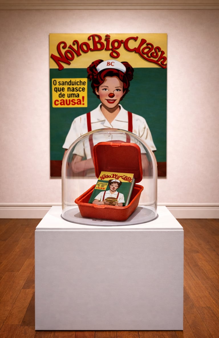 O diálogo com Os Operários, de Tarsila, surge pela geometria da repetição. Onde havia rostos e singularidade, aqui há recipientes idênticos, preparados para receber e esvaziar. A produção fabril cede espaço à circulação de comportamento. A escolha, reduzida ao gesto mínimo e repetido, espelha o modelo que fragmenta a experiência e converte pensamento em resposta instantânea.